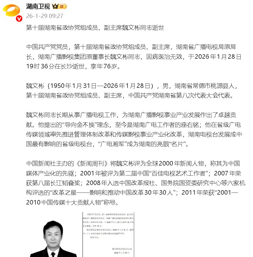 1月29日,湖南卫视发布讣告,湖南省广播电视局原局长,湖南广播影视集团原董事长魏文彬因病医治无效于昨日去世,享年76岁。据悉,魏文彬提出的“导向金不换”理念,至今是湖南广电工作者的座右铭。他曾领导湖南电视台进行变革,推出《快乐大本营》《乡村发现》《玫瑰之约》《真情》《新青年》等节目,将湖南电视台发展成中国最有影响的地方电视台。介绍其经历的《魏文彬和他的电视湘军》也是众多媒体人必读书目。